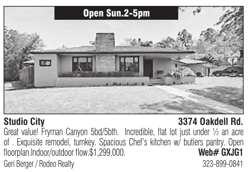 Great value! Fryman Canyon 5bd/5bth. Incredible, flat lot just under 1⁄2 an acre of . Exquisite remodel, turnkey. Spacious Chef’s kitchen w/ butlers pantry. Open floorplan.Indoor/outdoor flow.$1,299,000. Web# GXJG1