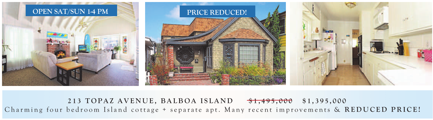 213 TOPAZ AVENUE, BALBOA ISLAND $1,495,000 $1,395,000 Charming four bedroom Island cottage + separate apt. Many recent improvements & REDUCED PRICE!