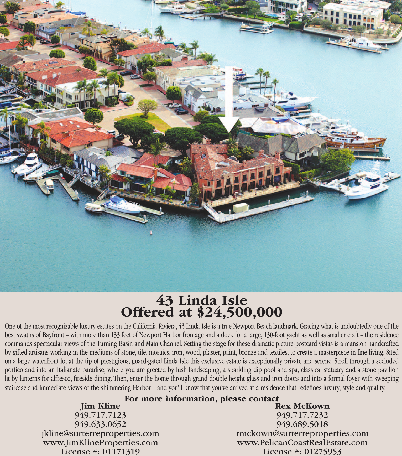 43 Linda Isle Offered at $24,500,000 One of the most recognizable luxury estates on the California Riviera, 43 Linda Isle is a true Newport Beach landmark. Gracing what is undoubtedly one of the best swaths of Bayfront – with more than 133 feet of Newport Harbor frontage and a dock for a large, 130-foot yacht as well as smaller craft – the residence commands spectacular views of the Turning Basin and Main Channel. Setting the stage for these dramatic picture-postcard vistas is a mansion handcrafted by gifted artisans working in the mediums of stone, tile, mosaics, iron, wood, plaster, paint, bronze and textiles, to create a masterpiece in fine living. Sited on a large waterfront lot at the tip of prestigious, guard-gated Linda Isle this exclusive estate is exceptionally private and serene. Stroll through a secluded portico and into an Italianate paradise, where you are greeted by lush landscaping, a sparkling dip pool and spa, classical statuary and a stone pavilion lit by lanterns for alfresco, fireside dining. Then, enter the home through grand double-height glass and iron doors and into a formal foyer with sweeping staircase and immediate views of the shimmering Harbor – and you'll know that you've arrived at a residence that redefines luxury, style and quality. Jim Kline 949.717.7123 949.633.0652 jkline@surterreproperties.com www.JimKlineProperties.com License #: 01171319 For more information, please contact Rex McKown 949.717.7232 949.689.5018 rmckown@surterreproperties.com www.PelicanCoastRealEstate.com License #: 01275953