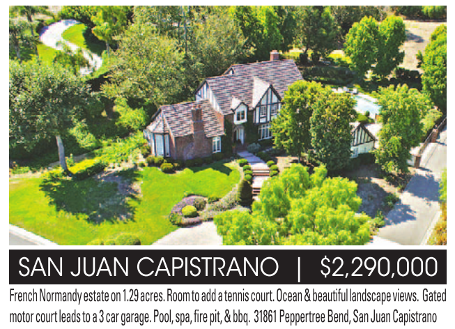 French Normandy estate on 1.29 acres. Room to add a tennis court. Ocean & beautiful landscape views. Gated motor court leads to a 3 car garage. Pool, spa, fire pit, & bbq. 31861 Peppertree Bend, San Juan Capistrano