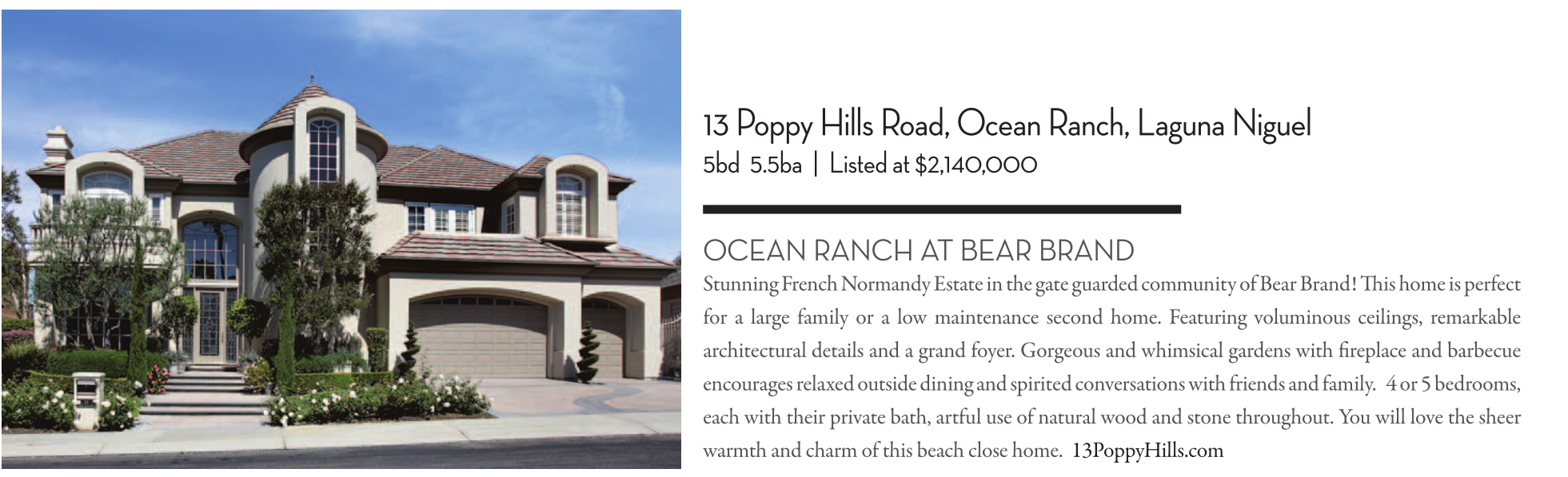 Stunning French Normandy Estate in the gate guarded community of Bear Brand! This home is perfect for a large family or a low maintenance second home. Featuring voluminous ceilings, remarkable architectural details and a grand foyer. Gorgeous and whimsical gardens with fireplace and barbecue encourages relaxed outside dining and spirited conversations with friends and family. 4 or 5 bedrooms, each with their private bath, artful use of natural wood and stone throughout. You will love the sheer warmth and charm of this beach close home. 13PoppyHills.com