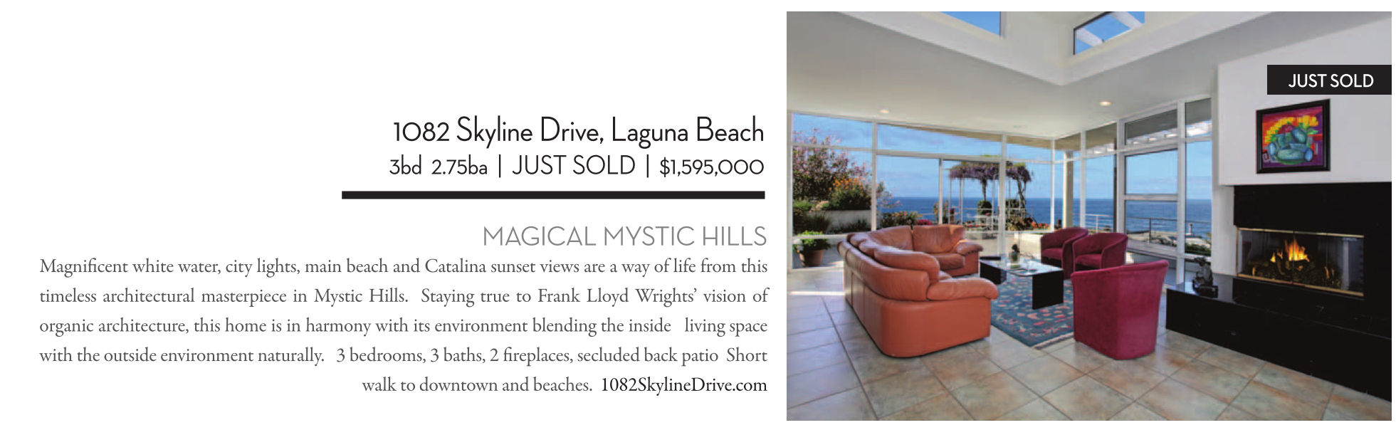 Magnificent white water, city lights, main beach and Catalina sunset views are a way of life from this timeless architectural masterpiece in Mystic Hills. Staying true to Frank Lloyd Wrights’ vision of organic architecture, this home is in harmony with its environment blending the inside living space with the outside environment naturally. 3 bedrooms, 3 baths, 2 fireplaces, secluded back patio Short walk to downtown and beaches. 1082SkylineDrive.com