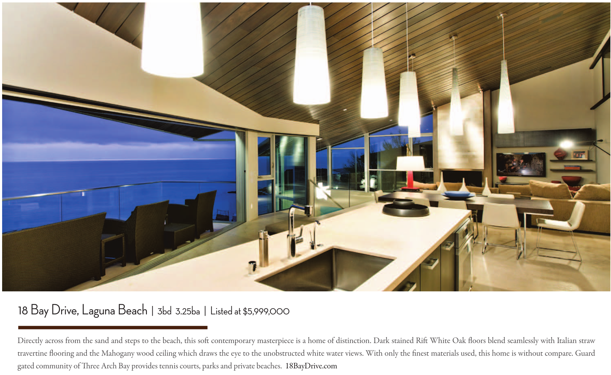 Directly across from the sand and steps to the beach, this soft contemporary masterpiece is a home of distinction. Dark stained Rift White Oak floors blend seamlessly with Italian straw travertine flooring and the Mahogany wood ceiling which draws the eye to the unobstructed white water views. With only the finest materials used, this home is without compare. Guard gated community of Three Arch Bay provides tennis courts, parks and private beaches. 18BayDrive.com