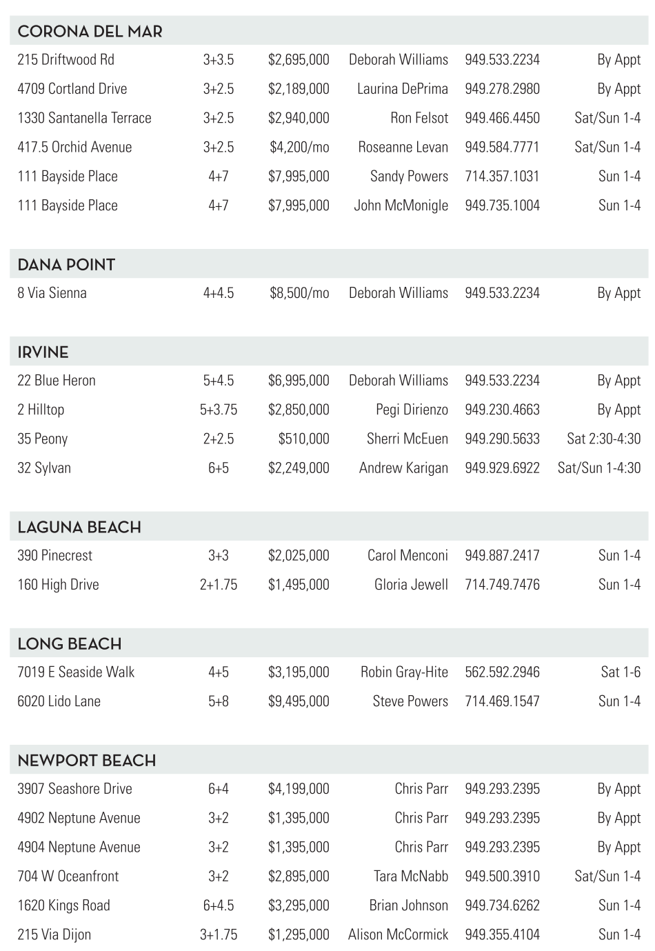 390 Pinecrest 3+3 $2,025,000 Carol Menconi 949.887.2417 Sun 1-4 160 High Drive 2+1.75 $1,495,000 Gloria Jewell 714.749.7476 Sun 1-4