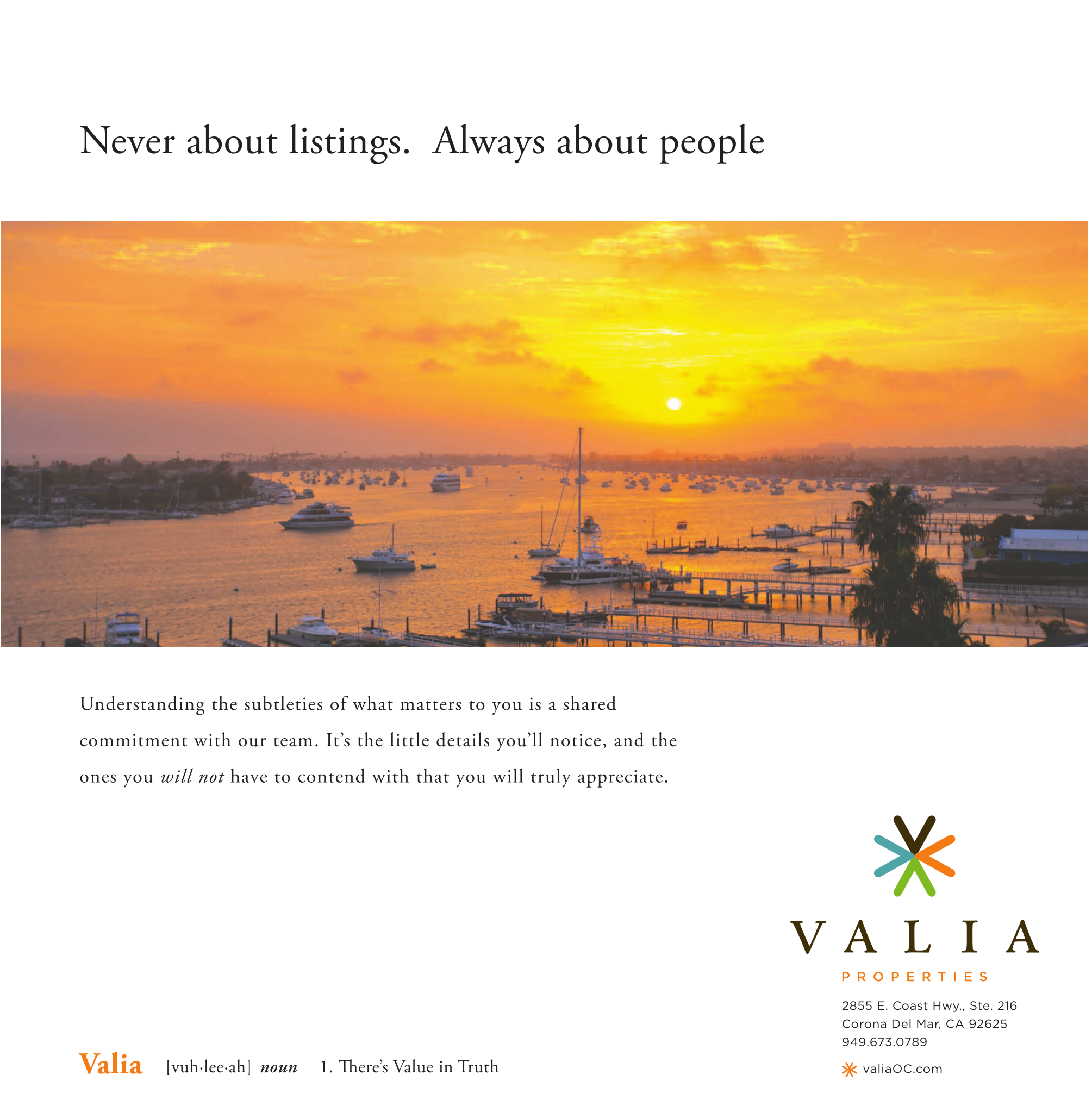 Never about listings. Always about people Understanding the subtleties of what matters to you is a shared commitment with our team. It’s the little details you’ll notice, and the ones you will not have to contend with that you will truly appreciate. Valia [vuh·lee·ah] noun 1. There’s Value in Truth 2855 E. Coast Hwy., Ste. 216 Corona Del Mar, CA 92625 949.673.0789 valiaOC.com