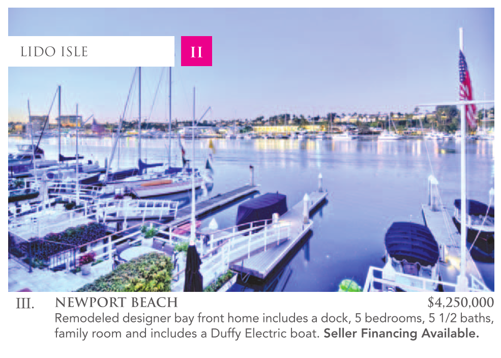 NEWPORT BEACH $4,250,000 Remodeled designer bay front home includes a dock, 5 bedrooms, 5 1/2 baths, family room and includes a Duffy Electric boat. Seller Financing Available.