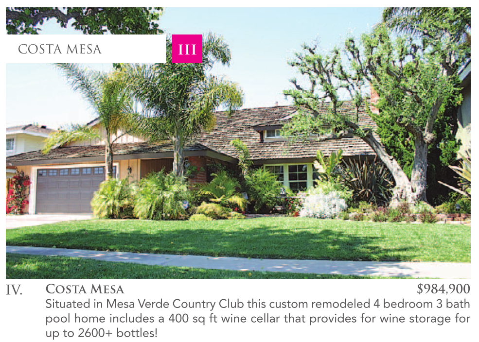 Costa Mesa $984,900 Situated in Mesa Verde Country Club this custom remodeled 4 bedroom 3 bath pool home includes a 400 sq ft wine cellar that provides for wine storage for up to 2600+ bottles!