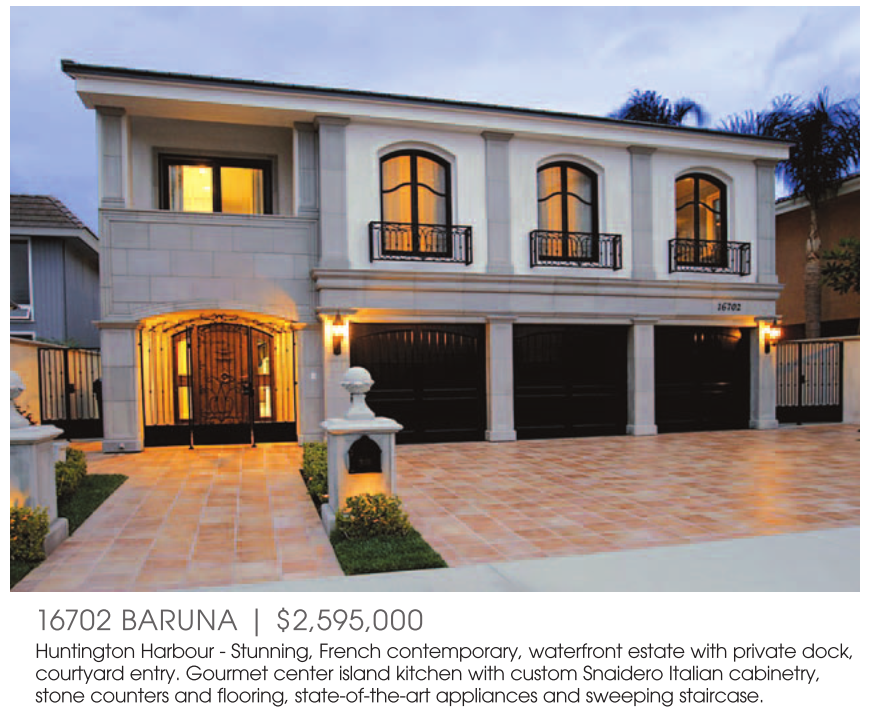 16702 BARUNA | $2,595,000 Huntington Harbour - Stunning, French contemporary, waterfront estate with private dock, courtyard entry. Gourmet center island kitchen with custom Snaidero Italian cabinetry, stone counters and flooring, state-of-the-art appliances and sweeping staircase.