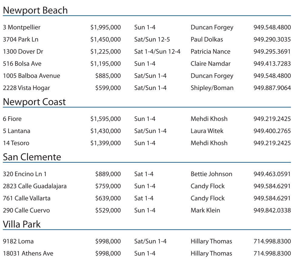 3 Montpellier $1,995,000 Sun 1-4 Duncan Forgey 949.548.4800 3704 Park Ln $1,450,000 Sat/Sun 12-5 Paul Dolkas 949.290.3035 1300 Dover Dr $1,225,000 Sat 1-4/Sun 12-4 Patricia Nance 949.295.3691 516 Bolsa Ave $1,195,000 Sun 1-4 Claire Namdar 949.413.7283 1005 Balboa Avenue $885,000 Sat/Sun 1-4 Duncan Forgey 949.548.4800 2228 Vista Hogar $599,000 Sat/Sun 1-4 Shipley/Boman 949.887.9064