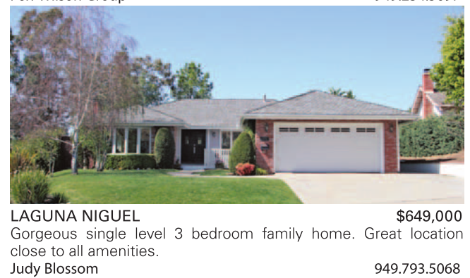 LAGUNA NIGUEL $649,000 Gorgeous single level 3 bedroom family home. Great location close to all amenities. Judy Blossom 949.793.5068