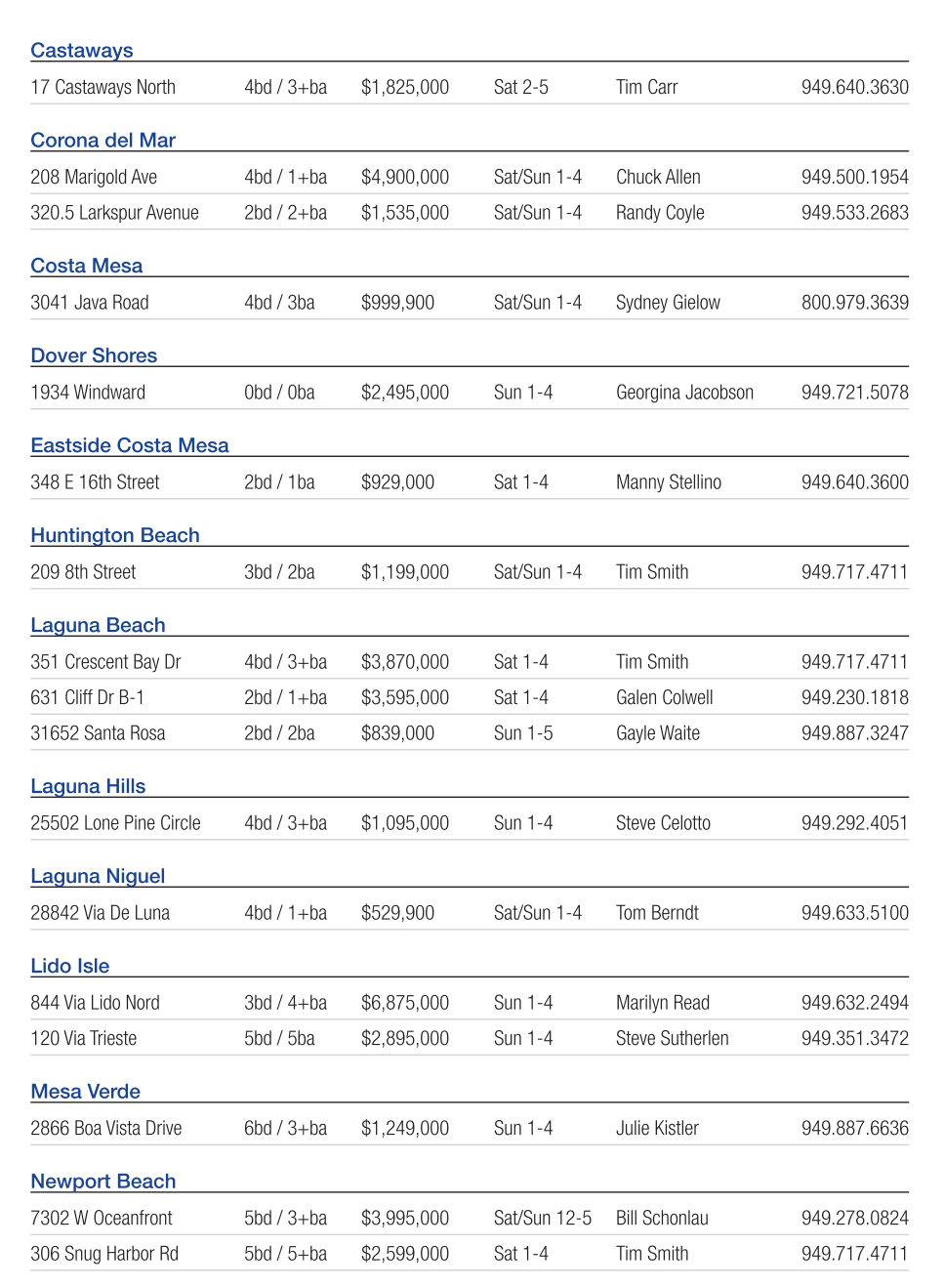 Laguna Beach 351 Crescent Bay Dr 4bd / 3+ba $3,870,000 Sat 1-4 Tim Smith 949.717.4711 631 Cliff Dr B-1 2bd / 1+ba $3,595,000 Sat 1-4 Galen Colwell 949.230.1818 31652 Santa Rosa 2bd / 2ba $839,000 Sun 1-5 Gayle Waite 949.887.3247
