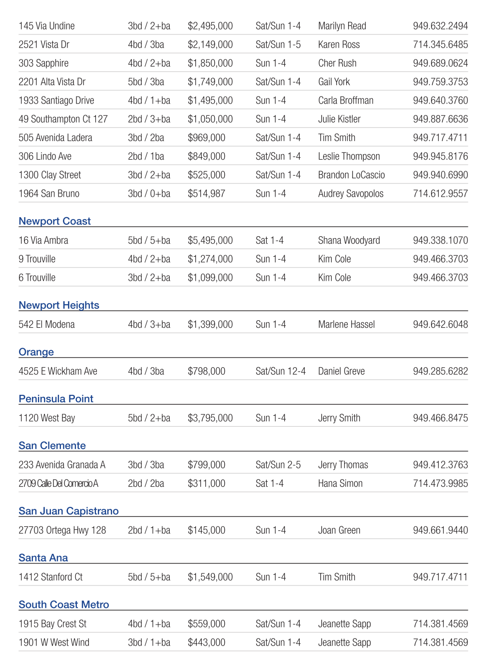 145 Via Undine 3bd / 2+ba $2,495,000 Sat/Sun 1-4 Marilyn Read 949.632.2494 2521 Vista Dr 4bd / 3ba $2,149,000 Sat/Sun 1-5 Karen Ross 714.345.6485 303 Sapphire 4bd / 2+ba $1,850,000 Sun 1-4 Cher Rush 949.689.0624 2201 Alta Vista Dr 5bd / 3ba $1,749,000 Sat/Sun 1-4 Gail York 949.759.3753 1933 Santiago Drive 4bd / 1+ba $1,495,000 Sun 1-4 Carla Broffman 949.640.3760 49 Southampton Ct 127 2bd / 3+ba $1,050,000 Sun 1-4 Julie Kistler 949.887.6636 505 Avenida Ladera 3bd / 2ba $969,000 Sat/Sun 1-4 Tim Smith 949.717.4711 306 Lindo Ave 2bd / 1ba $849,000 Sat/Sun 1-4 Leslie Thompson 949.945.8176 1300 Clay Street 3bd / 2+ba $525,000 Sat/Sun 1-4 Brandon LoCascio 949.940.6990 1964 San Bruno 3bd / 0+ba $514,987 Sun 1-4 Audrey Savopolos 714.612.9557