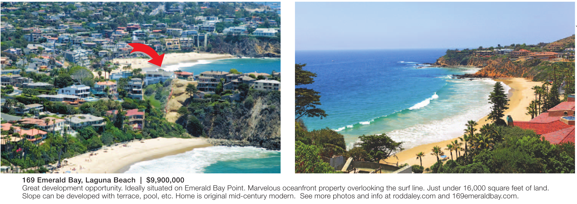 169 Emerald Bay, Laguna Beach | $9,900,000 Great development opportunity. Ideally situated on Emerald Bay Point. Marvelous oceanfront property overlooking the surf line. Just under 16,000 square feet of land. Slope can be developed with terrace, pool, etc. Home is original mid-century modern. See more photos and info at roddaley.com and 169emeraldbay.com.