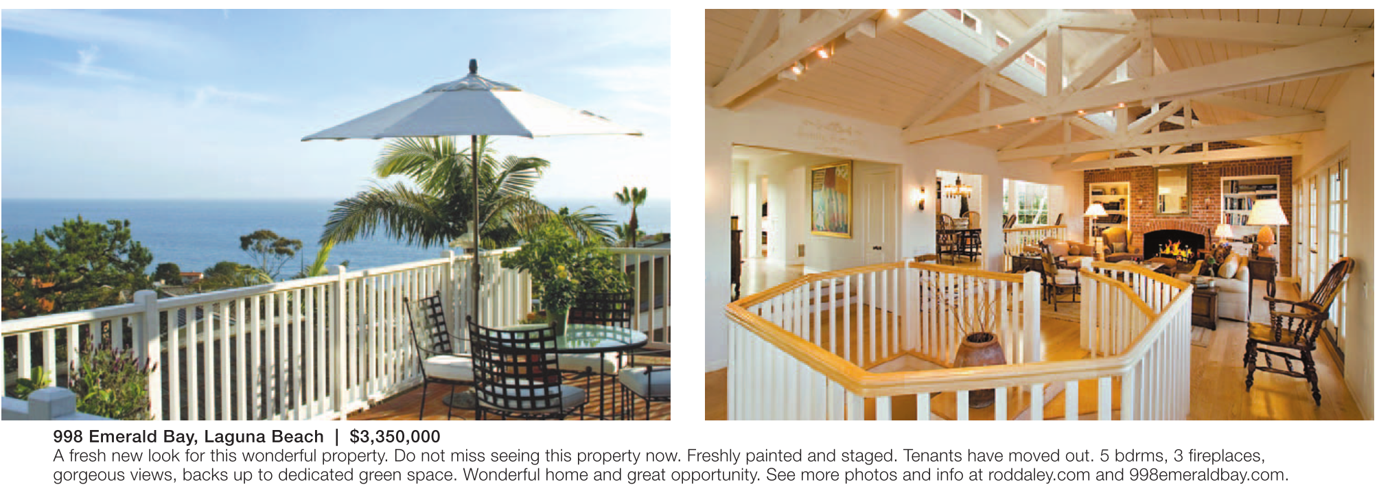 998 Emerald Bay, Laguna Beach | $3,350,000 A fresh new look for this wonderful property. Do not miss seeing this property now. Freshly painted and staged. Tenants have moved out. 5 bdrms, 3 fireplaces, gorgeous views, backs up to dedicated green space. Wonderful home and great opportunity. See more photos and info at roddaley.com and 998emeraldbay.com.