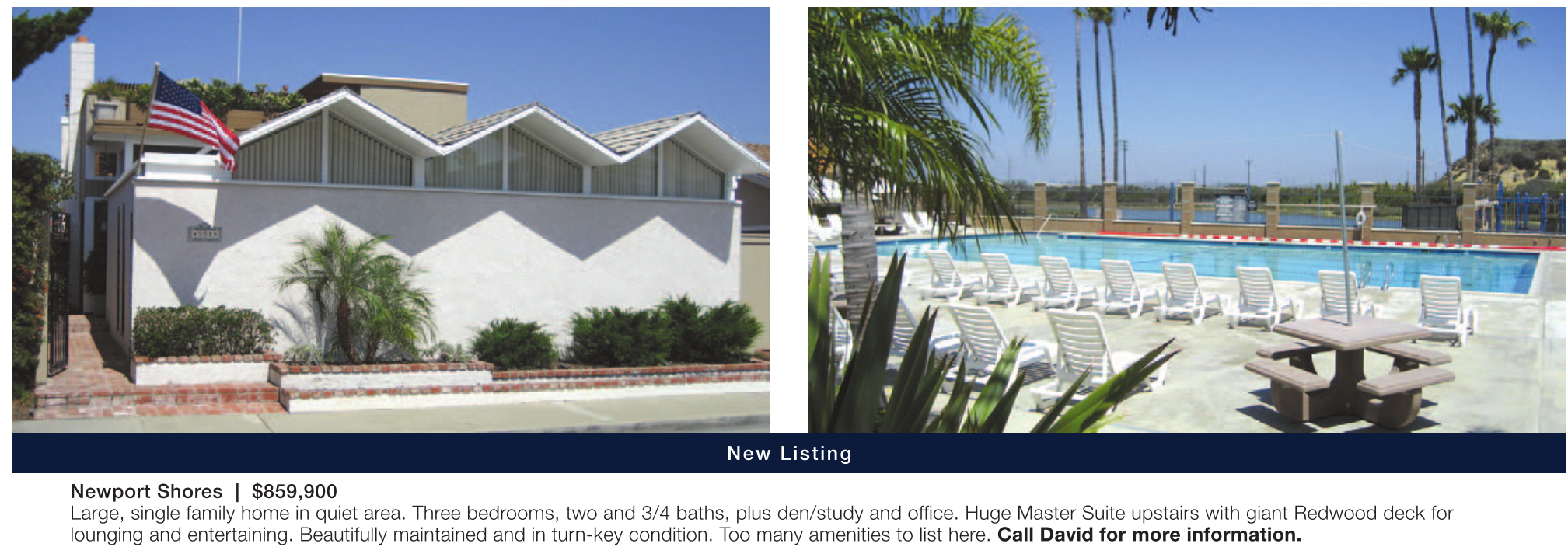 New Listing Newport Shores | $859,900 Large, single family home in quiet area. Three bedrooms, two and 3/4 baths, plus den/study and office. Huge Master Suite upstairs with giant Redwood deck for lounging and entertaining. Beautifully maintained and in turn-key condition. Too many amenities to list here. Call David for more information.