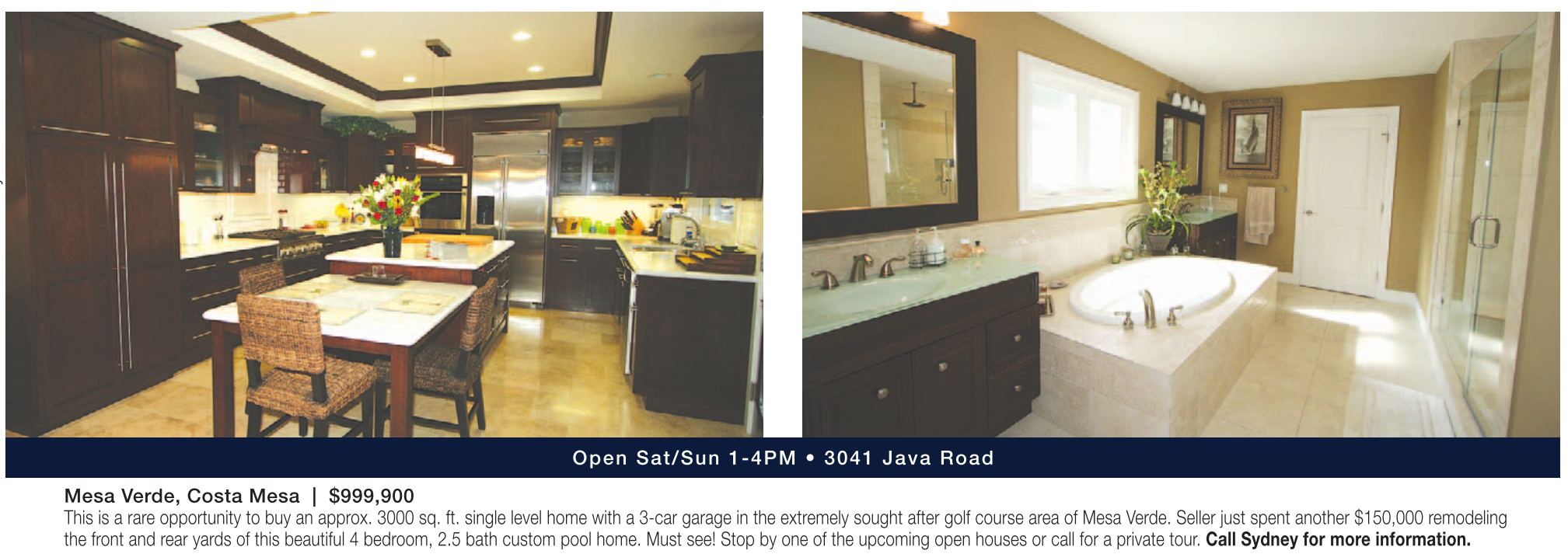 Mesa Verde, Costa Mesa | $999,900 This is a rare opportunity to buy an approx. 3000 sq. ft. single level home with a 3-car garage in the extremely sought after golf course area of Mesa Verde. Seller just spent another $150,000 remodeling the front and rear yards of this beautiful 4 bedroom, 2.5 bath custom pool home. Must see! Stop by one of the upcoming open houses or call for a private tour. Call Sydney for more information.