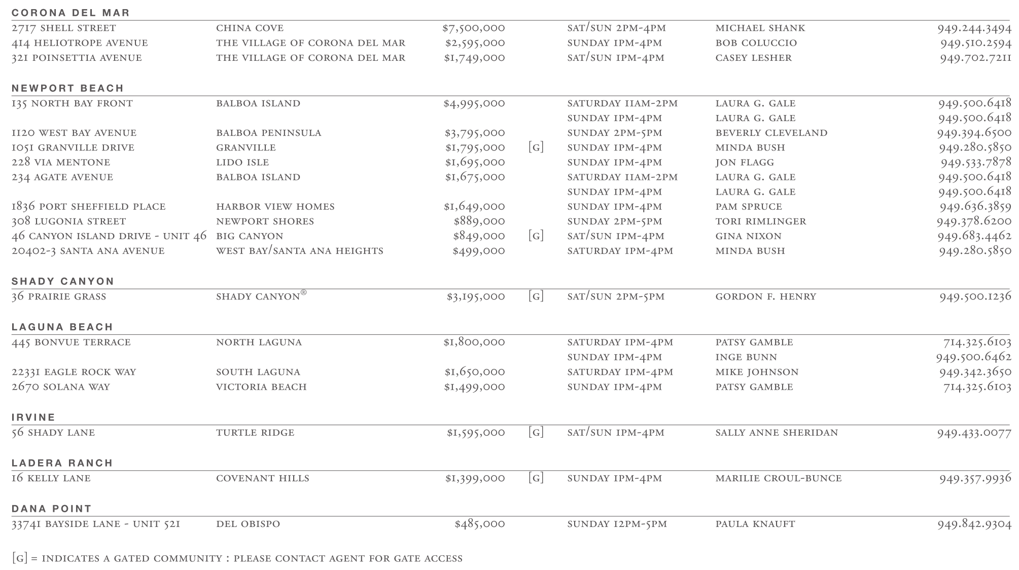 NEWPORT BEACH 135 north bay front balboa island $4,995,000 saturday 11am-2pm laura g. gale 949.500.6418 sunday 1pm-4pm laura g. gale 949.500.6418 1120 west bay avenue balboa peninsula $3,795,000 sunday 2pm-5pm beverly cleveland 949.394.6500 1051 granville drive granville $1,795,000 [g] sunday 1pm-4pm minda bush 949.280.5850 228 via mentone lido isle $1,695,000 sunday 1pm-4pm jon flagg 949.533.7878 234 agate avenue balboa island $1,675,000 saturday 11am-2pm laura g. gale 949.500.6418 sunday 1pm-4pm laura g. gale 949.500.6418 1836 port sheffield place harbor view homes $1,649,000 sunday 1pm-4pm pam spruce 949.636.3859 308 lugonia street newport shores $889,000 sunday 2pm-5pm tori rimlinger 949.378.6200 46 canyon island drive - unit 46 big canyon $849,000 [g] sat/sun 1pm-4pm gina nixon 949.683.4462 20402-3 santa ana avenue west bay/santa ana heights $499,000 saturday 1pm-4pm minda bush 949.280.5850