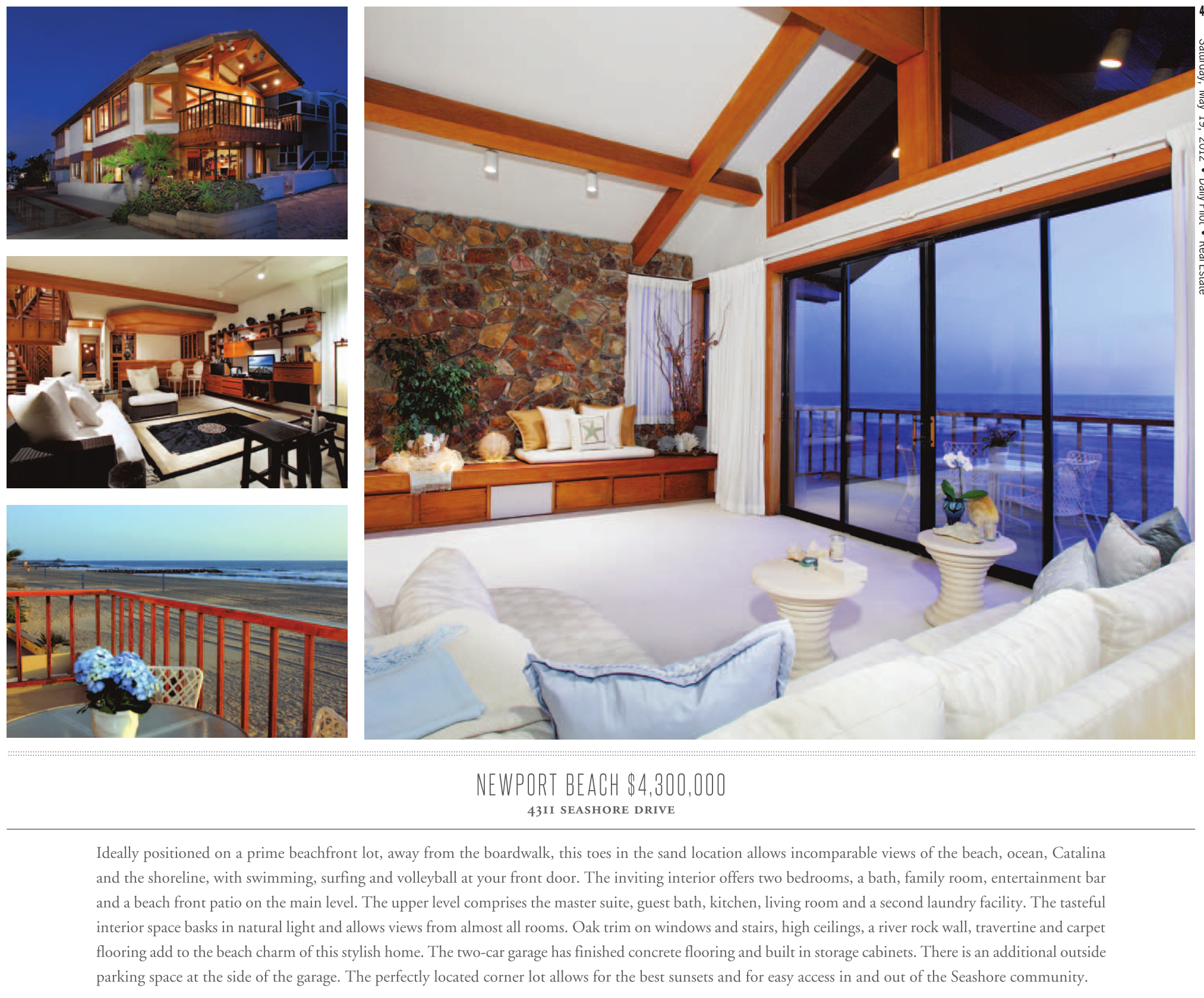 49 NEWPORT BEACH $4,300,000 4311 seashore drive Ideally positioned on a prime beachfront lot, away from the boardwalk, this toes in the sand location allows incomparable views of the beach, ocean, Catalina and the shoreline, with swimming, surfing and volleyball at your front door. The inviting interior offers two bedrooms, a bath, family room, entertainment bar and a beach front patio on the main level. The upper level comprises the master suite, guest bath, kitchen, living room and a second laundry facility. The tasteful interior space basks in natural light and allows views from almost all rooms. Oak trim on windows and stairs, high ceilings, a river rock wall, travertine and carpet flooring add to the beach charm of this stylish home. The two-car garage has finished concrete flooring and built in storage cabinets. There is an additional outside parking space at the side of the garage. The perfectly located corner lot allows for the best sunsets and for easy access in and out of the Seashore community.