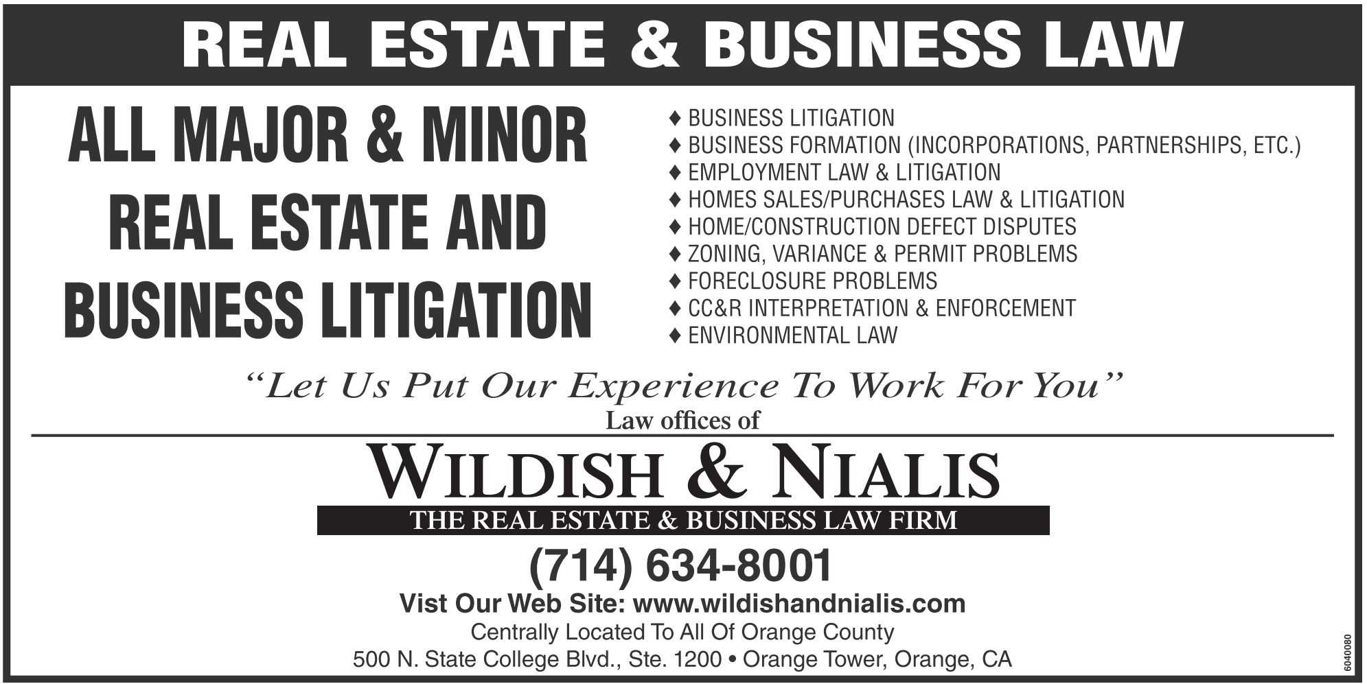 EMPLOYMENT LAW & LITIGATION HOMES SALES/PURCHASES LAW & LITIGATION HOME/CONSTRUCTION DEFECT DISPUTES ZONING, VARIANCE & PERMIT PROBLEMS FORECLOSURE PROBLEMS CC&R INTERPRETATION & ENFORCEMENT ENVIRONMENTAL LAW