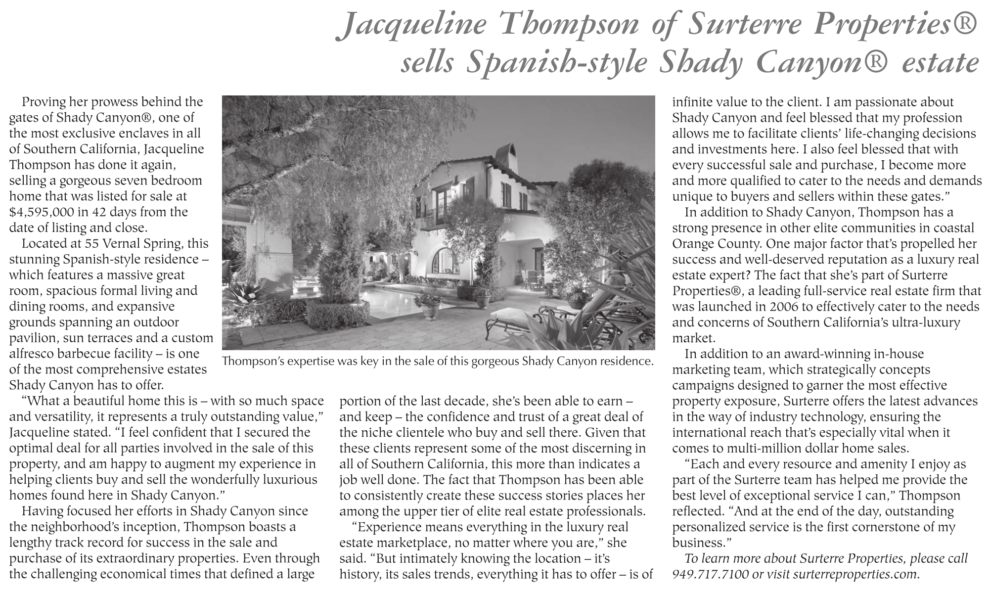 Jacqueline Thompson of Surterre Properties® sells Spanish-style Shady Canyon® estate