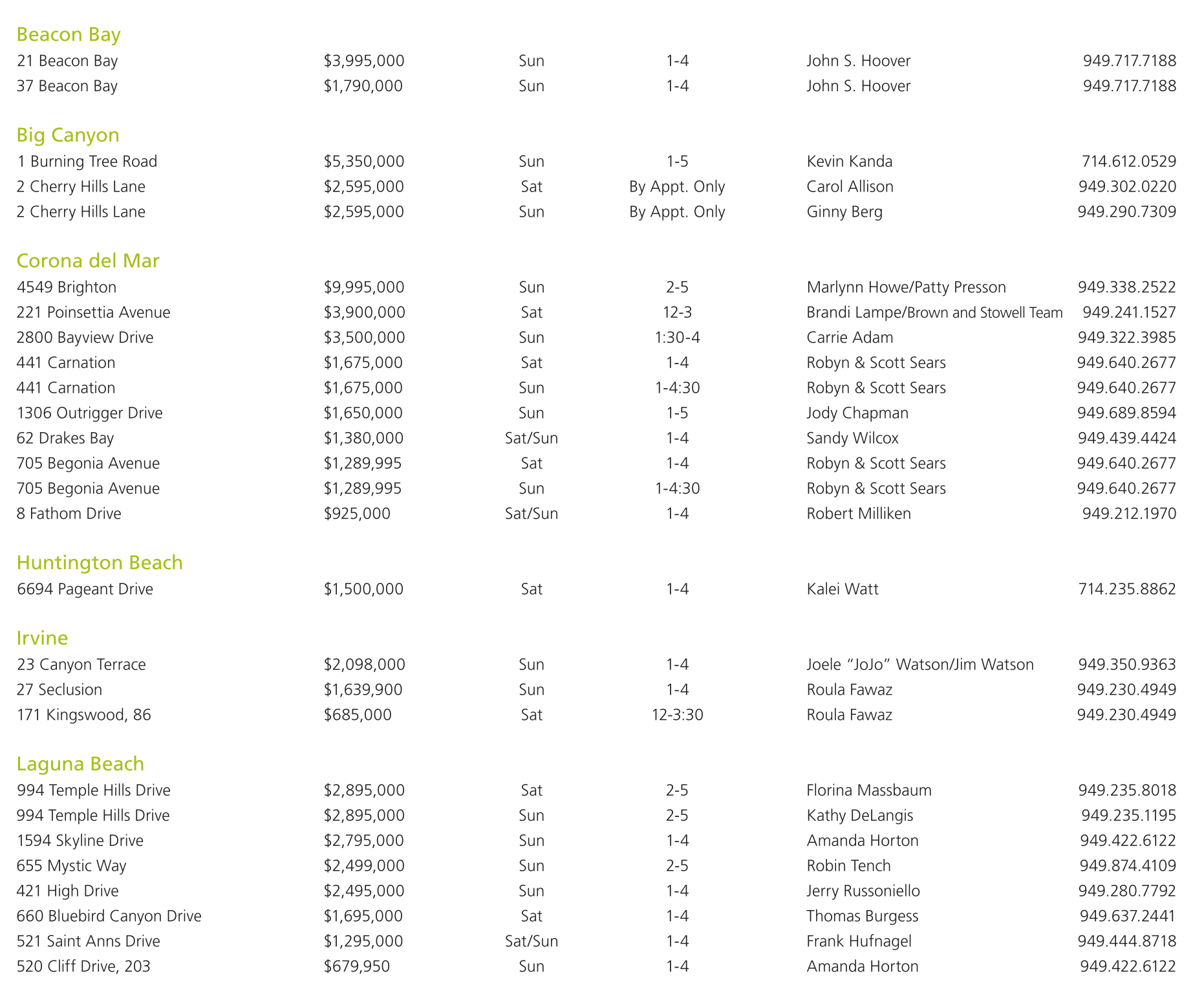 Big Canyon 1 Burning Tree Road $5,350,000 Sun 1-5 Kevin Kanda 714.612.0529 2 Cherry Hills Lane $2,595,000 Sat By Appt. Only Carol Allison 949.302.0220 2 Cherry Hills Lane $2,595,000 Sun By Appt. Only Ginny Berg 949.290.7309