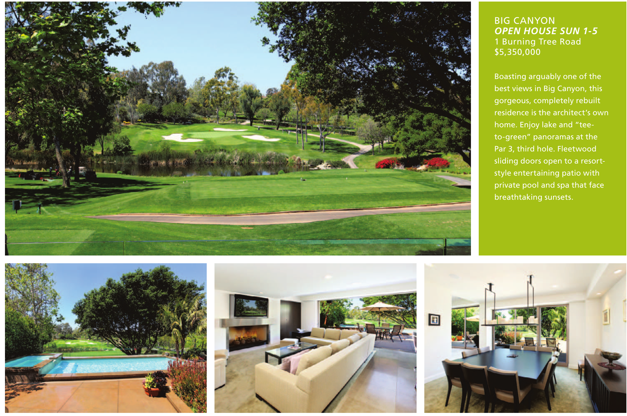 BIG CANYON OPEN HOUSE SUN 1-5 1 Burning Tree Road $5,350,000 Boasting arguably one of the best views in Big Canyon, this gorgeous, completely rebuilt residence is the architect’s own home. Enjoy lake and “teeto-green” panoramas at the Par 3, third hole. Fleetwood sliding doors open to a resortstyle entertaining patio with private pool and spa that face breathtaking sunsets.