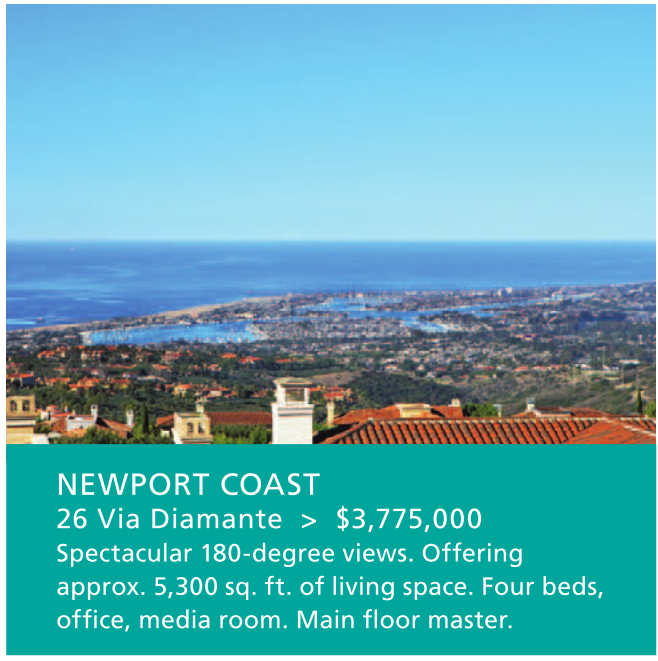 NEWPORT COAST 26 Via Diamante > $3,775,000 Spectacular 180-degree views. Offering approx. 5,300 sq. ft. of living space. Four beds, office, media room. Main floor master.