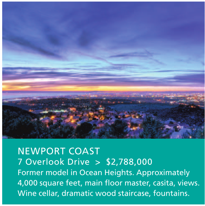 NEWPORT COAST 7 Overlook Drive > $2,788,000 Former model in Ocean Heights. Approximately 4,000 square feet, main floor master, casita, views. Wine cellar, dramatic wood staircase, fountains.