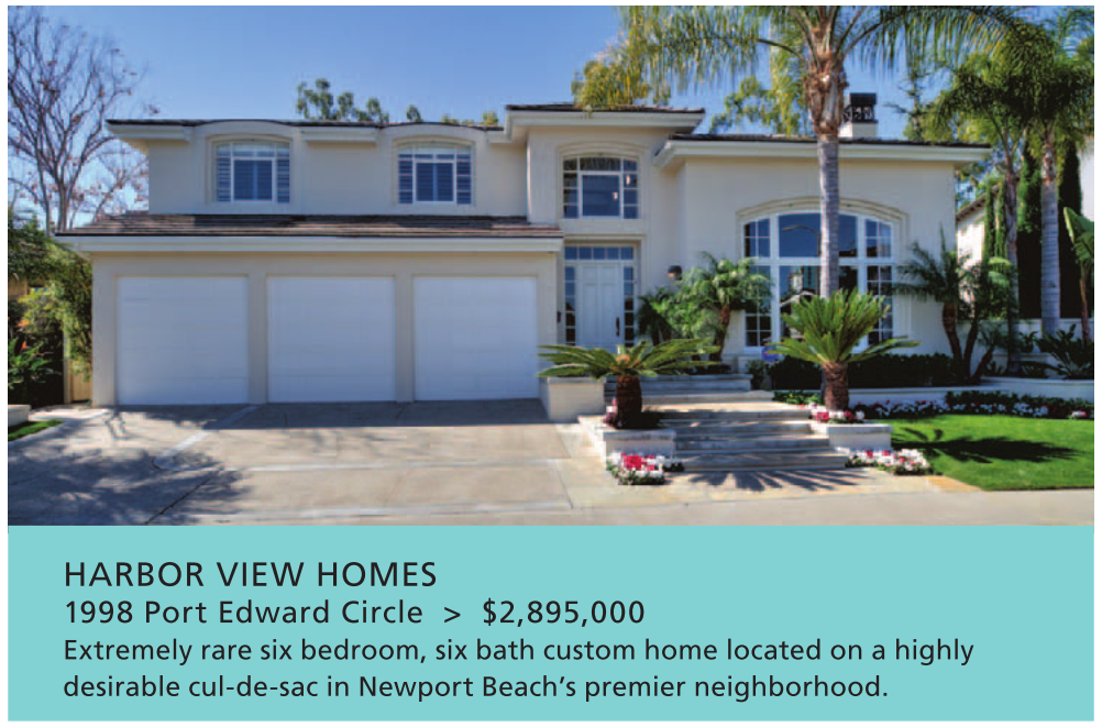 HARBOR VIEW HOMES 1998 Port Edward Circle > $2,895,000 Extremely rare six bedroom, six bath custom home located on a highly desirable cul-de-sac in Newport Beach’s premier neighborhood.