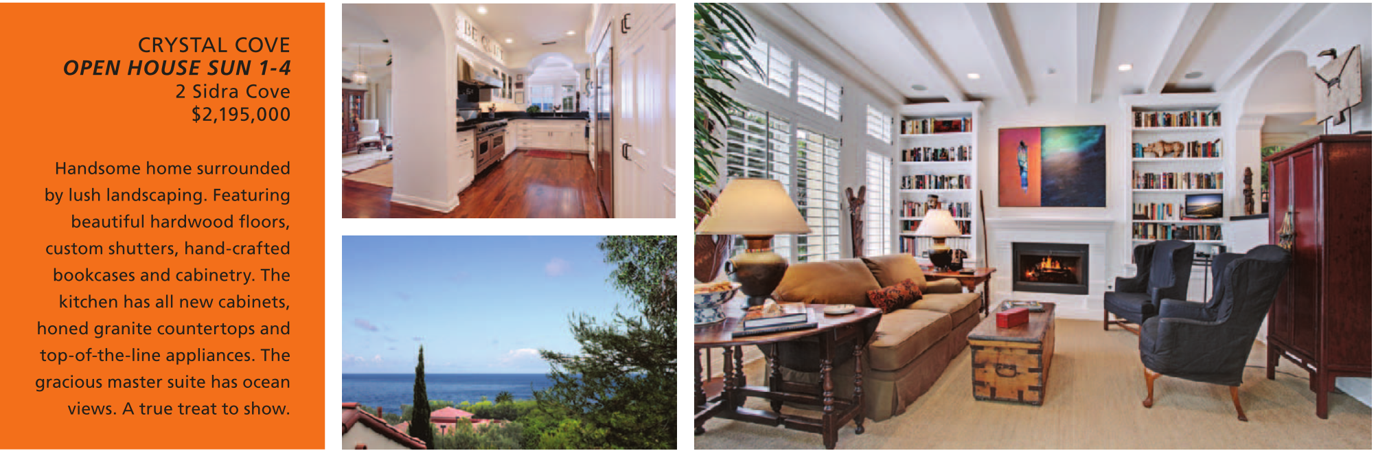 CRYSTAL COVE OPEN HOUSE SUN 1-4 2 Sidra Cove $2,195,000 Handsome home surrounded by lush landscaping. Featuring beautiful hardwood floors, custom shutters, hand-crafted bookcases and cabinetry. The kitchen has all new cabinets, honed granite countertops and top-of-the-line appliances. The gracious master suite has ocean views. A true treat to show.