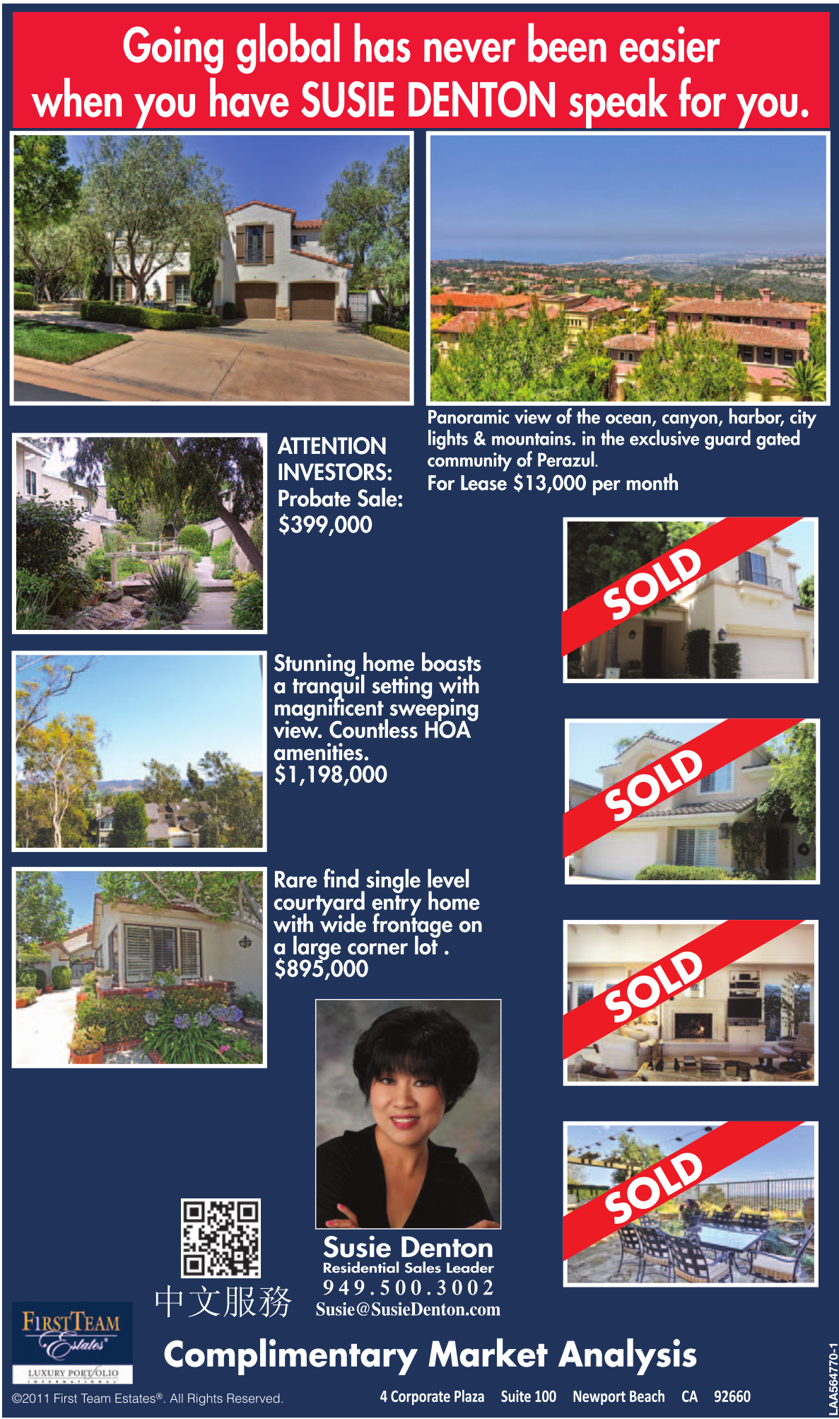Going global has never been easier when you have SUSIE DENTON speak for you. ATTENTION INVESTORS: Probate Sale: $399,000 Panoramic view of the ocean, canyon, harbor, city lights & mountains. in the exclusive guard gated community of Perazul. For Lease $13,000 per month Stunning home boasts a tranquil setting with magnificent sweeping view. Countless HOA amenities. $1,198,000 Rare find single level courtyard entry home with wide frontage on a large corner lot . $895,000 ©2011 First Team Estates ® . All Rights Reserved. Susie Denton Residential Sales Leader 9 4 9 . 5 0 0 . 3 0 0 2 Susie@SusieDenton.com Complimentary Market Analysis 4 Corporate Plaza Suite 100 Newport Beach CA 92660