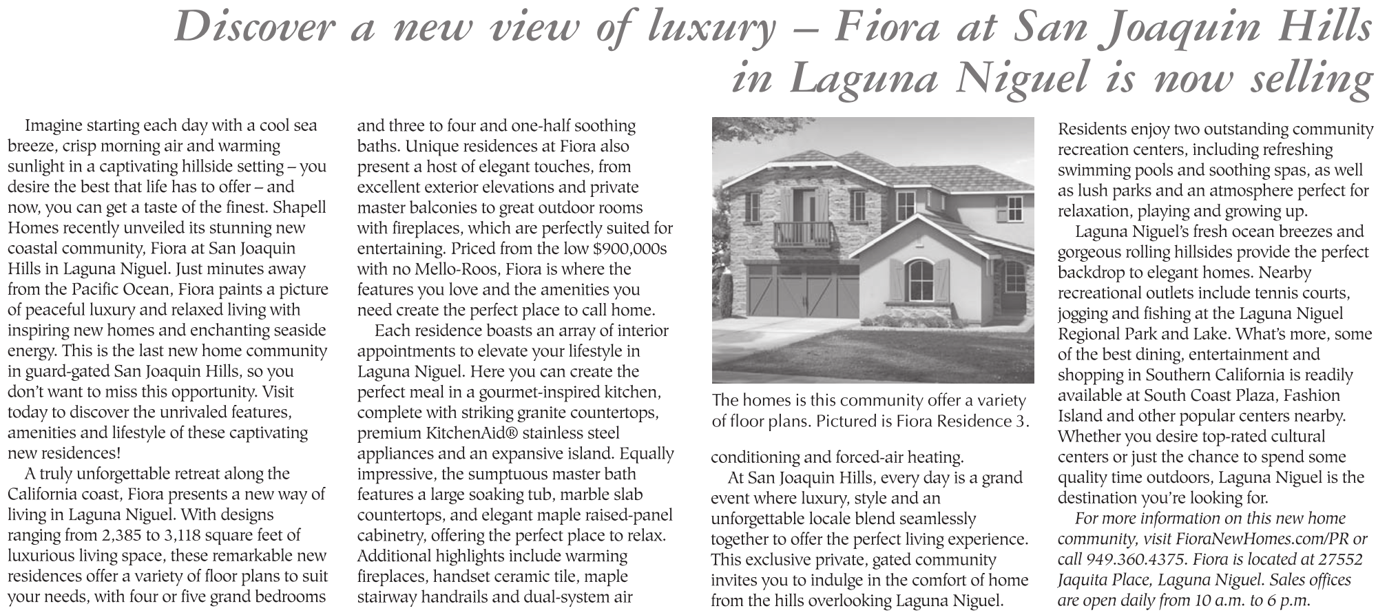 For more information on this new home community, visit FioraNewHomes.com/PR or call 949.360.4375. Fiora is located at 27552 Jaquita Place, Laguna Niguel. Sales offices are open daily from 10 a.m. to 6 p.m.