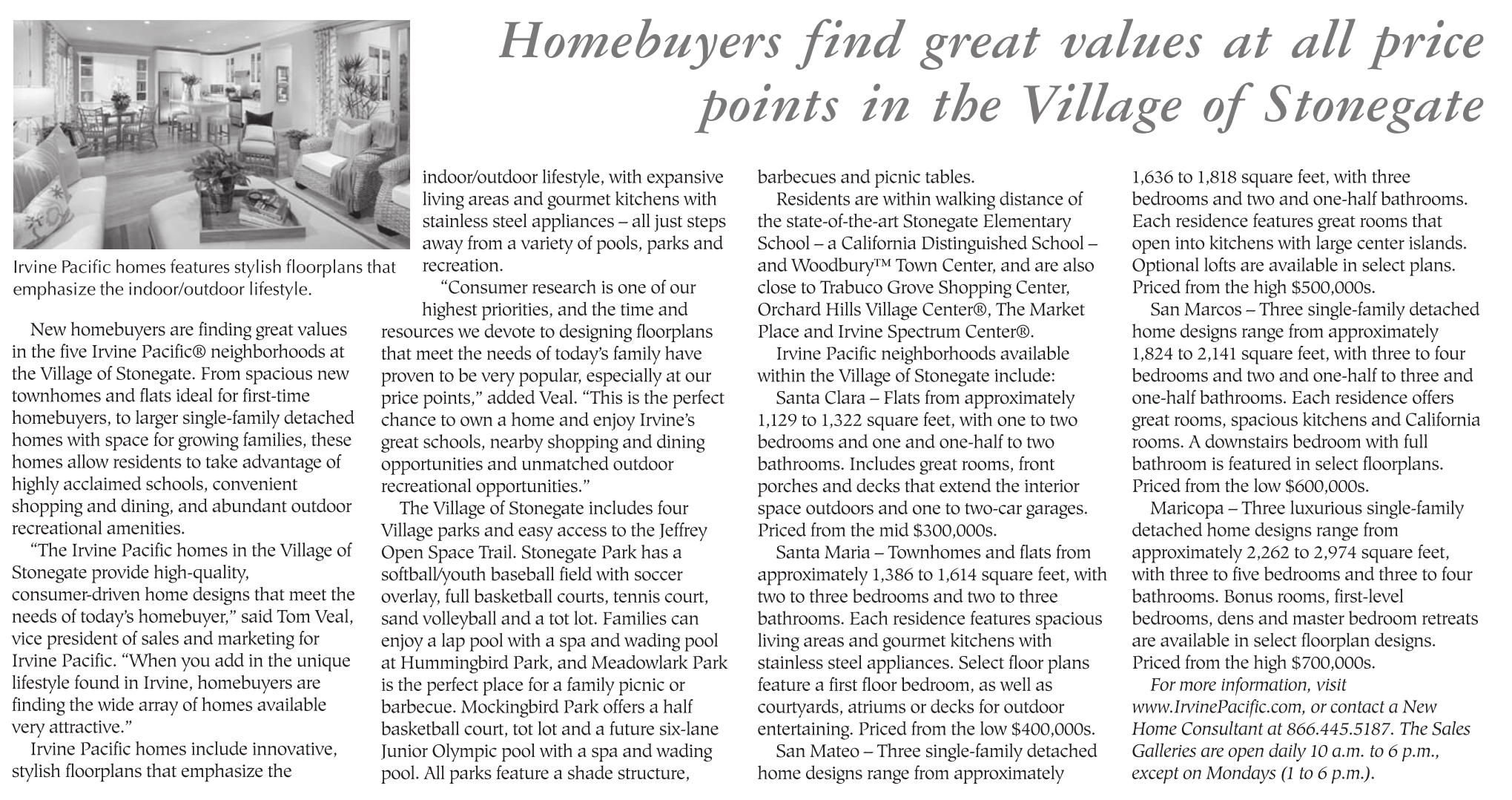 indoor/outdoor lifestyle, with expansive living areas and gourmet kitchens with stainless steel appliances – all just steps away from a variety of pools, parks and Irvine Pacific homes features stylish floorplans that recreation. emphasize the indoor/outdoor lifestyle. “Consumer research is one of our highest priorities, and the time and New homebuyers are finding great values resources we devote to designing floorplans in the five Irvine Pacific® neighborhoods at that meet the needs of today’s family have the Village of Stonegate. From spacious new proven to be very popular, especially at our townhomes and flats ideal for first-time price points,” added Veal. “This is the perfect homebuyers, to larger single-family detached chance to own a home and enjoy Irvine’s homes with space for growing families, these great schools, nearby shopping and dining homes allow residents to take advantage of opportunities and unmatched outdoor highly acclaimed schools, convenient recreational opportunities.” shopping and dining, and abundant outdoor The Village of Stonegate includes four recreational amenities. Village parks and easy access to the Jeffrey “The Irvine Pacific homes in the Village of Open Space Trail. Stonegate Park has a Stonegate provide high-quality, softball/youth baseball field with soccer consumer-driven home designs that meet the overlay, full basketball courts, tennis court, needs of today’s homebuyer,” said Tom Veal, sand volleyball and a tot lot. Families can vice president of sales and marketing for enjoy a lap pool with a spa and wading pool Irvine Pacific. “When you add in the unique at Hummingbird Park, and Meadowlark Park lifestyle found in Irvine, homebuyers are is the perfect place for a family picnic or finding the wide array of homes available barbecue. Mockingbird Park offers a half very attractive.” basketball court, tot lot and a future six-lane Irvine Pacific homes include innovative, Junior Olympic pool with a spa and wading stylish floorplans that emphasize the pool. All parks feature a shade structure,