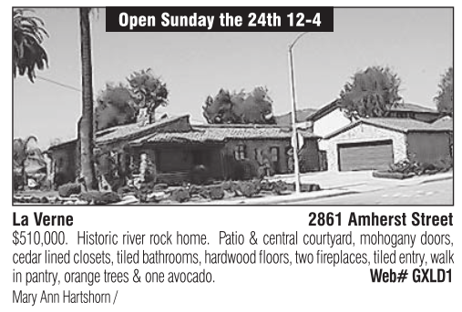 Open Sunday the 24th 12-4 La Verne 2861 Amherst Street $510,000. Historic river rock home. Patio & central courtyard, mohogany doors, cedar lined closets, tiled bathrooms, hardwood floors, two fireplaces, tiled entry, walk in pantry, orange trees & one avocado. Web# GXLD1 Mary Ann Hartshorn /