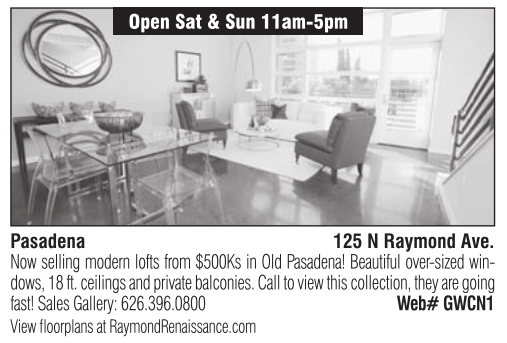 Pasadena 125 N Raymond Ave. Now selling modern lofts from $500Ks in Old Pasadena! Beautiful over-sized windows, 18 ft. ceilings and private balconies. Call to view this collection, they are going fast! Sales Gallery: 626.396.0800 Web# GWCN1 View floorplans at RaymondRenaissance.com