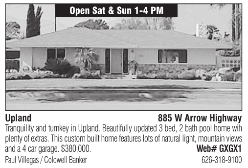 Open Sat & Sun 1-4 PM Upland 885 W Arrow Highway Tranquility and turnkey in Upland. Beautifully updated 3 bed, 2 bath pool home wih plenty of extras. This custom built home features lots of natural light, mountain views and a 4 car garage. $380,000. Web# GXGX1 Paul Villegas / Coldwell Banker 626-318-9100