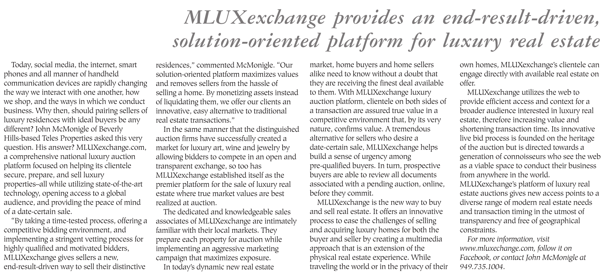 Today, social media, the internet, smart phones and all manner of handheld communication devices are rapidly changing the way we interact with one another, how we shop, and the ways in which we conduct business. Why then, should pairing sellers of luxury residences with ideal buyers be any different? John McMonigle of Beverly Hills-based Teles Properties asked this very question. His answer? MLUXexchange.com, a comprehensive national luxury auction platform focused on helping its clientele secure, prepare, and sell luxury properties–all while utilizing state-of-the-art technology, opening access to a global audience, and providing the peace of mind of a date-certain sale.