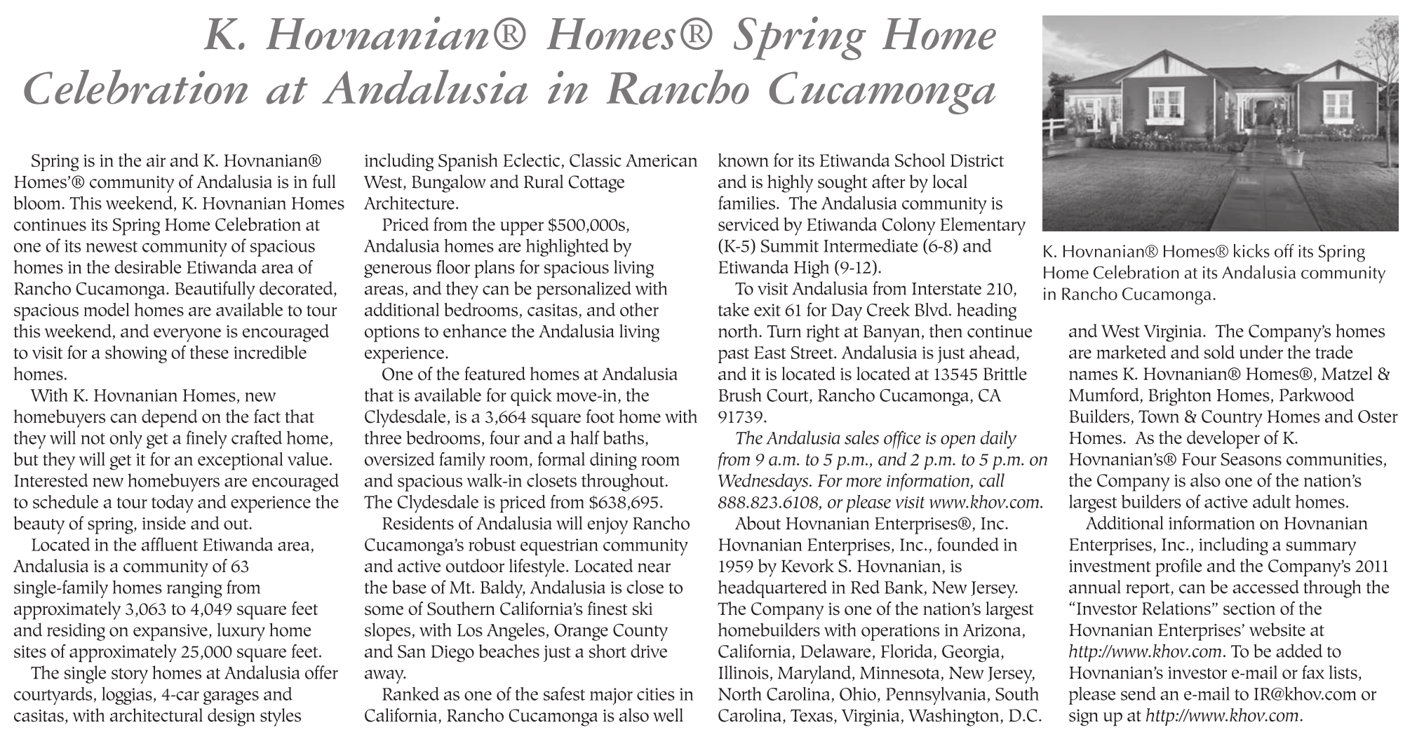 Spring is in the air and K. Hovnanian® Homes’® community of Andalusia is in full bloom. This weekend, K. Hovnanian Homes continues its Spring Home Celebration at one of its newest community of spacious homes in the desirable Etiwanda area of Rancho Cucamonga. Beautifully decorated, spacious model homes are available to tour this weekend, and everyone is encouraged to visit for a showing of these incredible homes.