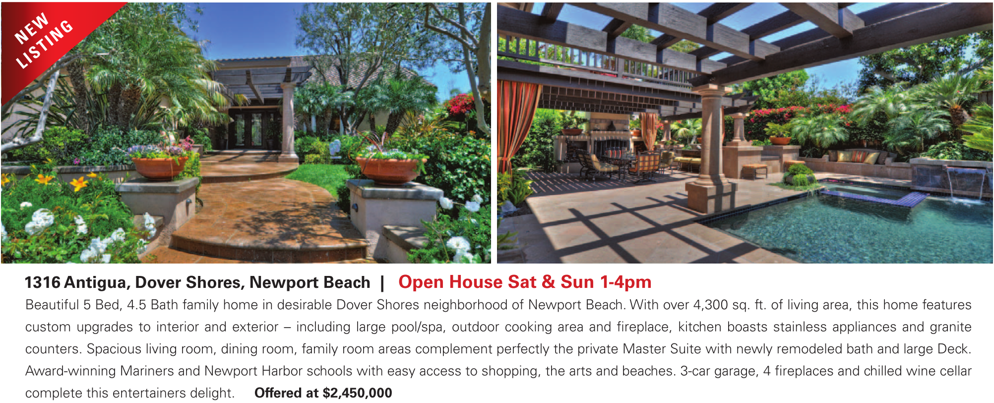 Beautiful 5 Bed, 4.5 Bath family home in desirable Dover Shores neighborhood of Newport Beach. With over 4,300 sq. ft. of living area, this home features custom upgrades to interior and exterior – including large pool/spa, outdoor cooking area and fireplace, kitchen boasts stainless appliances and granite counters. Spacious living room, dining room, family room areas complement perfectly the private Master Suite with newly remodeled bath and large Deck. Award-winning Mariners and Newport Harbor schools with easy access to shopping, the arts and beaches. 3-car garage, 4 fireplaces and chilled wine cellar complete this entertainers delight. Offered at $2,450,000