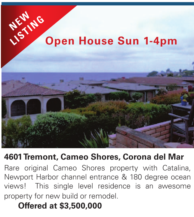 Open House Sun 1-4pm 4601 Tremont, Cameo Shores, Corona del Mar Rare original Cameo Shores property with Catalina, Newport Harbor channel entrance & 180 degree ocean views! This single level residence is an awesome property for new build or remodel. Offered at $3,500,000