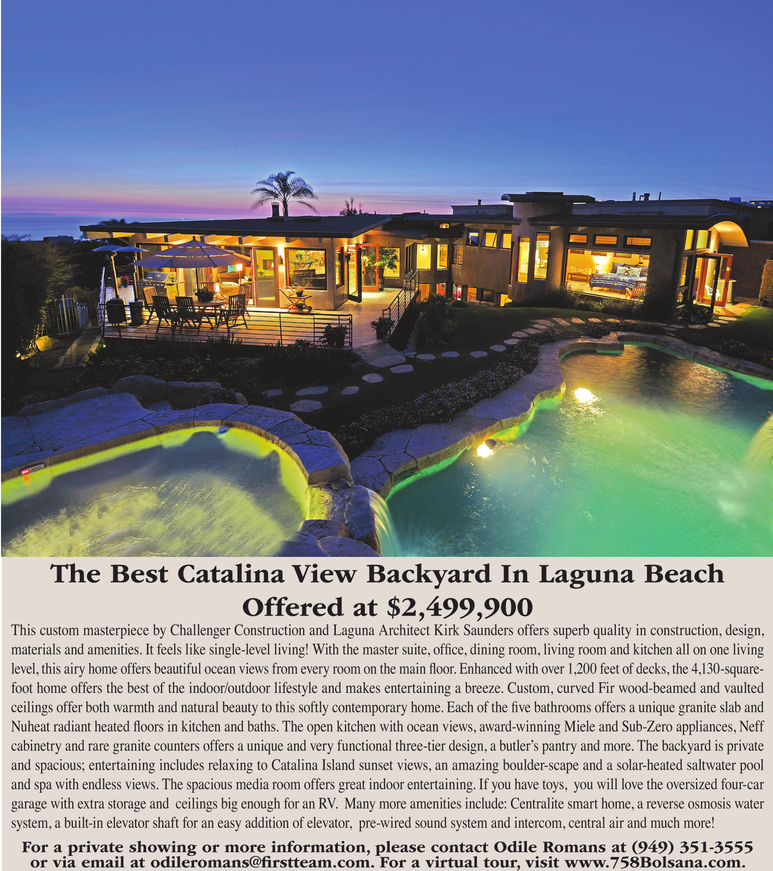 The Best Catalina View Backyard In Laguna Beach Offered at $2,499,900 This custom masterpiece by Challenger Construction and Laguna Architect Kirk Saunders offers superb quality in construction, design, materials and amenities. It feels like single-level living! With the master suite, office, dining room, living room and kitchen all on one living level, this airy home offers beautiful ocean views from every room on the main floor. Enhanced with over 1,200 feet of decks, the 4,130-squarefoot home offers the best of the indoor/outdoor lifestyle and makes entertaining a breeze. Custom, curved Fir wood-beamed and vaulted ceilings offer both warmth and natural beauty to this softly contemporary home. Each of the five bathrooms offers a unique granite slab and Nuheat radiant heated floors in kitchen and baths. The open kitchen with ocean views, award-winning Miele and Sub-Zero appliances, Neff cabinetry and rare granite counters offers a unique and very functional three-tier design, a butler’s pantry and more. The backyard is private and spacious; entertaining includes relaxing to Catalina Island sunset views, an amazing boulder-scape and a solar-heated saltwater pool and spa with endless views. The spacious media room offers great indoor entertaining. If you have toys, you will love the oversized four-car garage with extra storage and ceilings big enough for an RV. Many more amenities include: Centralite smart home, a reverse osmosis water system, a built-in elevator shaft for an easy addition of elevator, pre-wired sound system and intercom, central air and much more! For a private showing or more information, please contact Odile Romans at (949) 351-3555 or via email at odileromans@firstteam.com. For a virtual tour, visit www.758Bolsana.com.