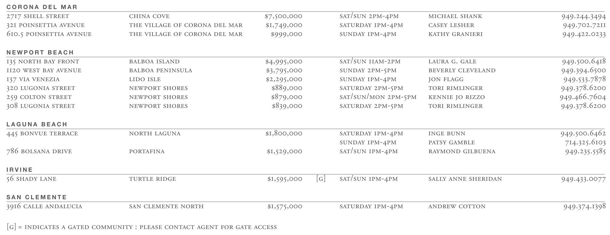 CORONA DEL MAR 2717 shell street china cove $7,500,000 sat/sun 2pm-4pm michael shank 949.244.3494 321 poinsettia avenue the village of corona del mar $1,749,000 saturday 1pm-4pm casey lesher 949.702.7211 610.5 poinsettia avenue the village of corona del mar $999,000 sunday 1pm-4pm kathy granieri 949.422.0233 NEWPORT BEACH 135 north bay front balboa island $4,995,000 sat/sun 11am-2pm laura g. gale 949.500.6418 1120 west bay avenue balboa peninsula $3,795,000 sunday 2pm-5pm beverly cleveland 949.394.6500 137 via venezia lido isle $2,295,000 sunday 1pm-4pm jon flagg 949.533.7878 320 lugonia street newport shores $889,000 saturday 2pm-5pm tori rimlinger 949.378.6200 259 colton street newport shores $879,000 sat/sun/mon 2pm-5pm kennie jo rizzo 949.466.7604 308 lugonia street newport shores $839,000 saturday 2pm-5pm tori rimlinger 949.378.6200 LAGUNA BEACH 445 bonvue terrace north laguna $1,800,000 saturday 1pm-4pm inge bunn 949.500.6462 sunday 1pm-4pm patsy gamble 714.325.6103 786 bolsana drive portafina $1,529,000 sat/sun 1pm-4pm raymond gilbuena 949.235.5585 IRVINE 56 shady lane turtle ridge $1,595,000 [g] sat/sun 1pm-4pm sally anne sheridan 949.433.0077 SAN CLEMENTE 3916 calle andalucia san clemente north $1,575,000 saturday 1pm-4pm andrew cotton 949.374.1398 [g] = indicates a gated community : please contact agent for gate access