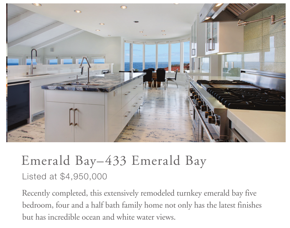 Listed at $4,950,000 Recently completed, this extensively remodeled turnkey emerald bay five bedroom, four and a half bath family home not only has the latest finishes but has incredible ocean and white water views.