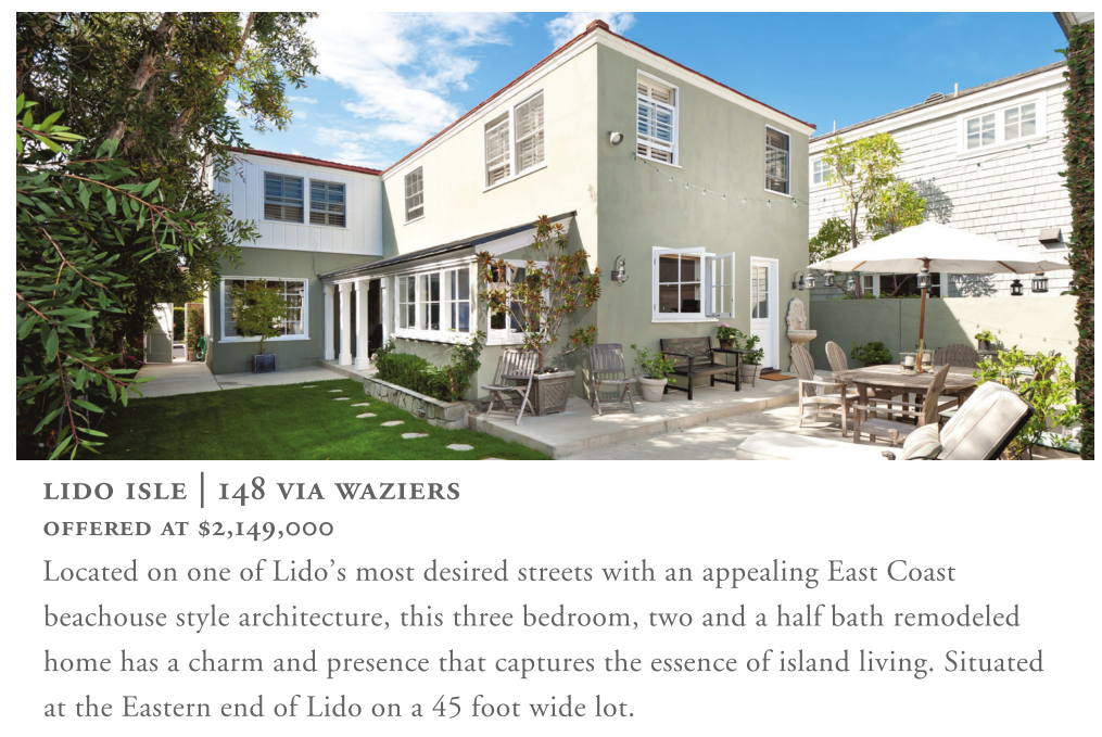 lido isle | 148 via waziers offered at $2,149,000 Located on one of Lido’s most desired streets with an appealing East Coast beachouse style architecture, this three bedroom, two and a half bath remodeled home has a charm and presence that captures the essence of island living. Situated at the Eastern end of Lido on a 45 foot wide lot.