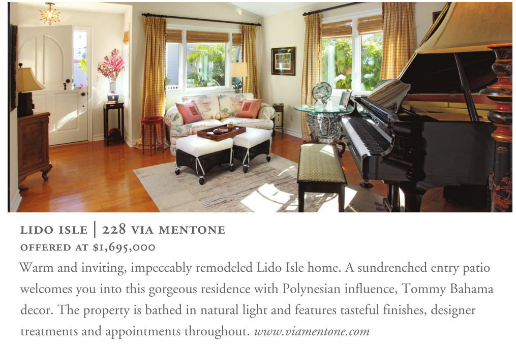 lido isle | 228 via mentone offered at $1,695,000