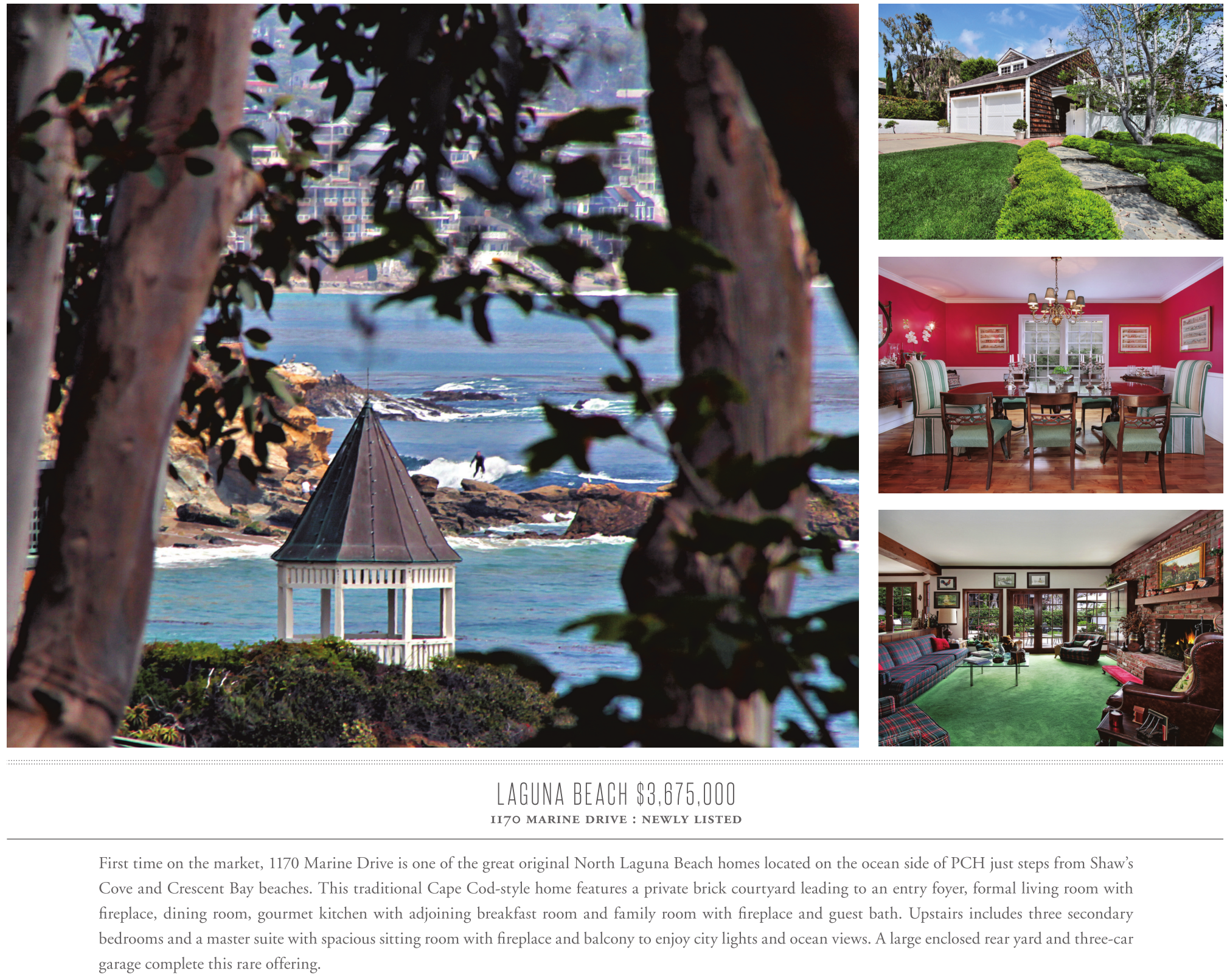 LAGUNA BEACH $3,675,000 1170 marine drive : newly listed First time on the market, 1170 Marine Drive is one of the great original North Laguna Beach homes located on the ocean side of PCH just steps from Shaw’s Cove and Crescent Bay beaches. This traditional Cape Cod-style home features a private brick courtyard leading to an entry foyer, formal living room with fireplace, dining room, gourmet kitchen with adjoining breakfast room and family room with fireplace and guest bath. Upstairs includes three secondary bedrooms and a master suite with spacious sitting room with fireplace and balcony to enjoy city lights and ocean views. A large enclosed rear yard and three-car garage complete this rare offering.