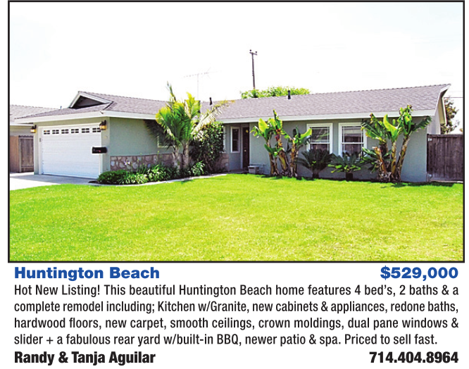 Huntington Beach $529,000 Hot New Listing! This beautiful Huntington Beach home features 4 bed’s, 2 baths & a complete remodel including; Kitchen w/Granite, new cabinets & appliances, redone baths, hardwood fl oors, new carpet, smooth ceilings, crown moldings, dual pane windows & slider + a fabulous rear yard w/built-in BBQ, newer patio & spa. Priced to sell fast. Randy & Tanja Aguilar 714.404.8964