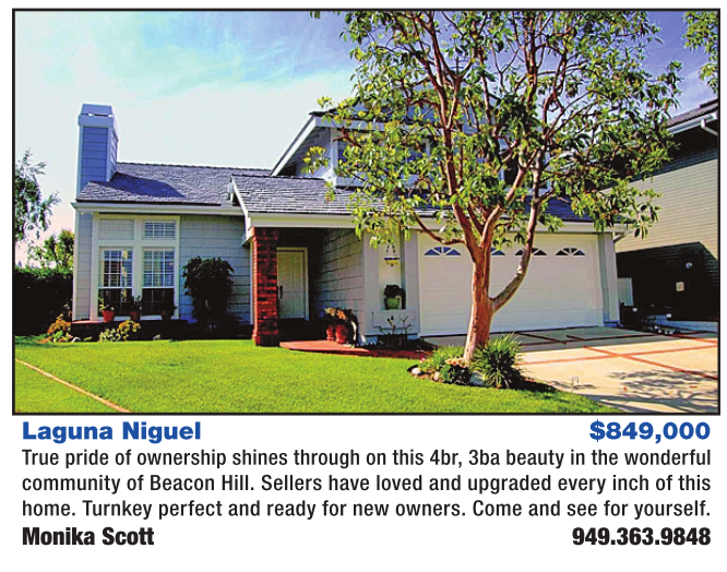 Laguna Niguel $849,000 True pride of ownership shines through on this 4br, 3ba beauty in the wonderful community of Beacon Hill. Sellers have loved and upgraded every inch of this home. Turnkey perfect and ready for new owners. Come and see for yourself. Monika Scott 949.363.9848