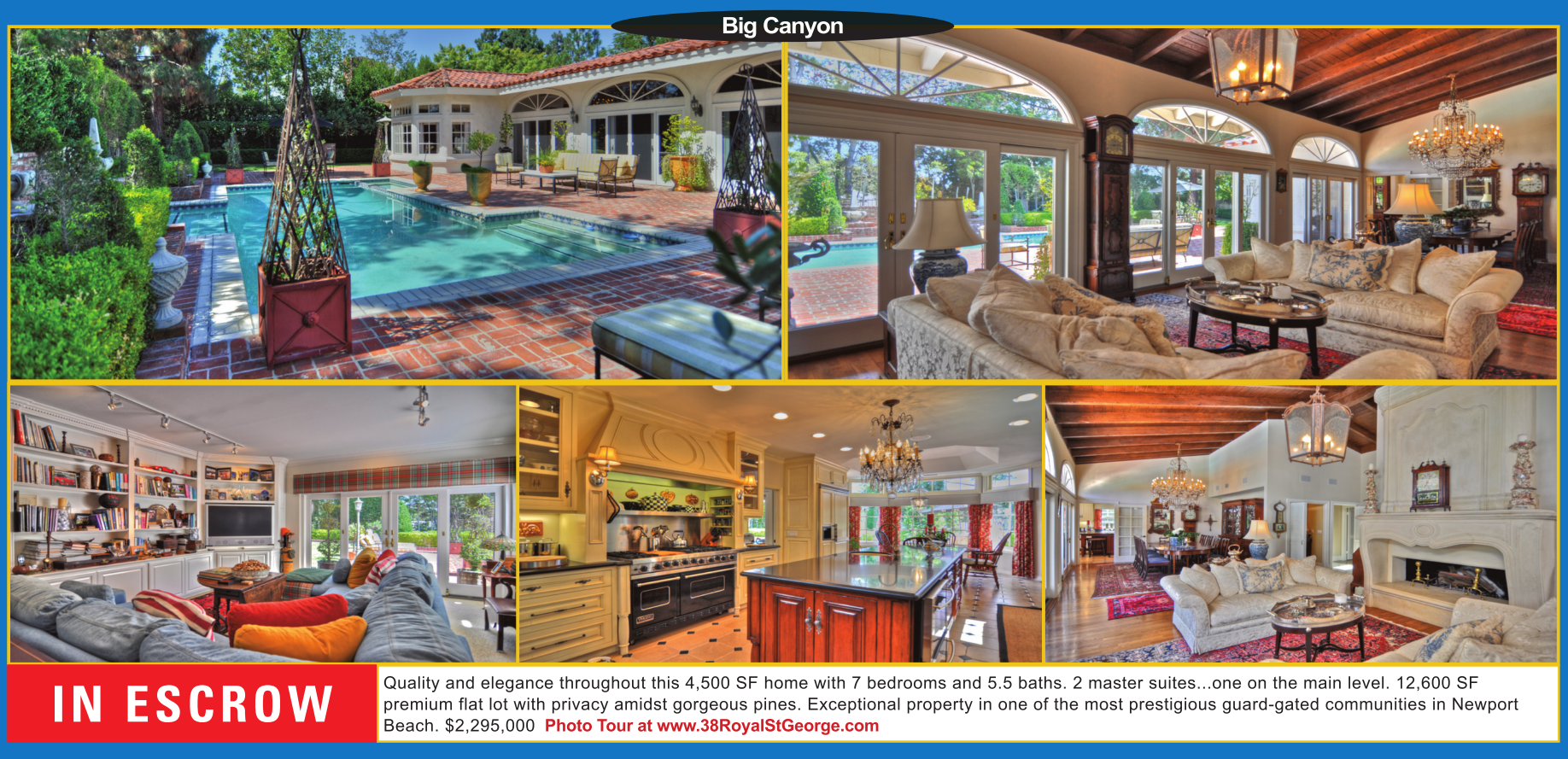 Big Canyon I N E S C R O W Quality and elegance throughout this 4,500 SF home with 7 bedrooms and 5.5 baths. 2 master suites...one on the main level. 12,600 SF premium flat lot with privacy amidst gorgeous pines. Exceptional property in one of the most prestigious guard-gated communities in Newport Beach. $2,295,000 Photo Tour at www.38RoyalStGeorge.com