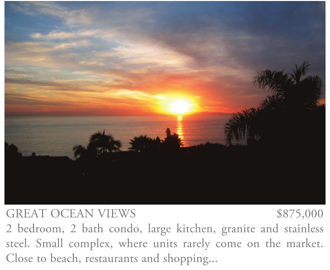 GREAT OCEAN VIEWS $875,000 2 bedroom, 2 bath condo, large kitchen, granite and stainless steel. Small complex, where units rarely come on the market. Close to beach, restaurants and shopping...